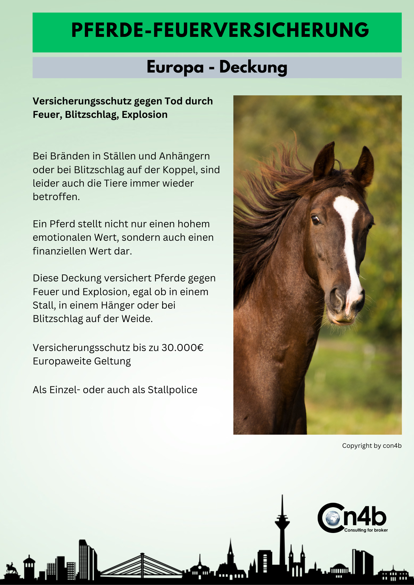 Individuell - nicht von der StangeWir betreiben noch individuelles Maklergeschäft. Policen werden individuell auf das Risiko angepasst.PersönlichUns kann man anrufen. Wir sind kein anonymer Onlineanbieter.Kompetent38 Jahre Erfahrung, spezielle Ausbildung und hohes technisches Verständnis gepaart mit Fachwissen. Eine Grundlage auf die man bauen kann.Vom Makler für Maklercon4b ist als Versicherungsmakler zugelassen, es gibt keine Beteiligungen von Versicherungsgesellschaften oder anderen Pools.